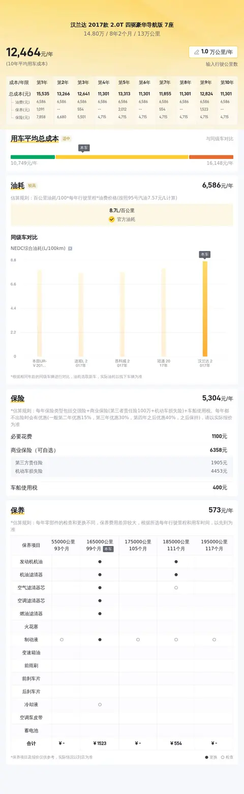 汉兰达 2017款 2.0T 四驱豪华导航版 7座的10年平均用车成本是12149元/年,而同级车最低是11171元/年,最高是13871元/年,所以用车成本适中。
