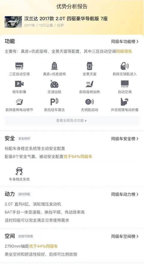 汉兰达(图片|配置|询价)属于一车难求的明星车型,主要是因为其出色的空间实用性和舒适的驾乘体验而受到市场的热烈追捧。作为一款大七座SUV,汉兰达在市场中的地位有目共睹,无论是家庭用户还是商务人士,都能在汉兰达找到适合自己用车场景。今天介绍的这辆2017年7月上牌的汉兰达 2017款 2.0T 四驱豪华导航版 7座,如今二手报价14.8万元,时隔8年多的时间,相当于打了5折,让我们来详细分析一下这辆车的情况。