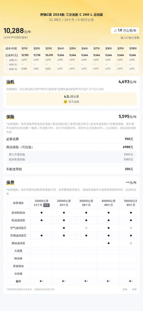 奔驰C级 2024款 三次改款 C 260 L 运动版车身尺寸为4882*1820*1461mm,轴距2954mm,车内空间较为宽敞,行李厢容积475L,可以容纳日常出行所需物品。采用1.5T 48V轻混动力系统,最大功率150kW,最大扭矩300N·m,9AT手自一体变速箱,换挡平顺,动力输出稳定。官方公布的百公里加速时间为7.8秒,WLTC综合油耗为6.45L/100km。