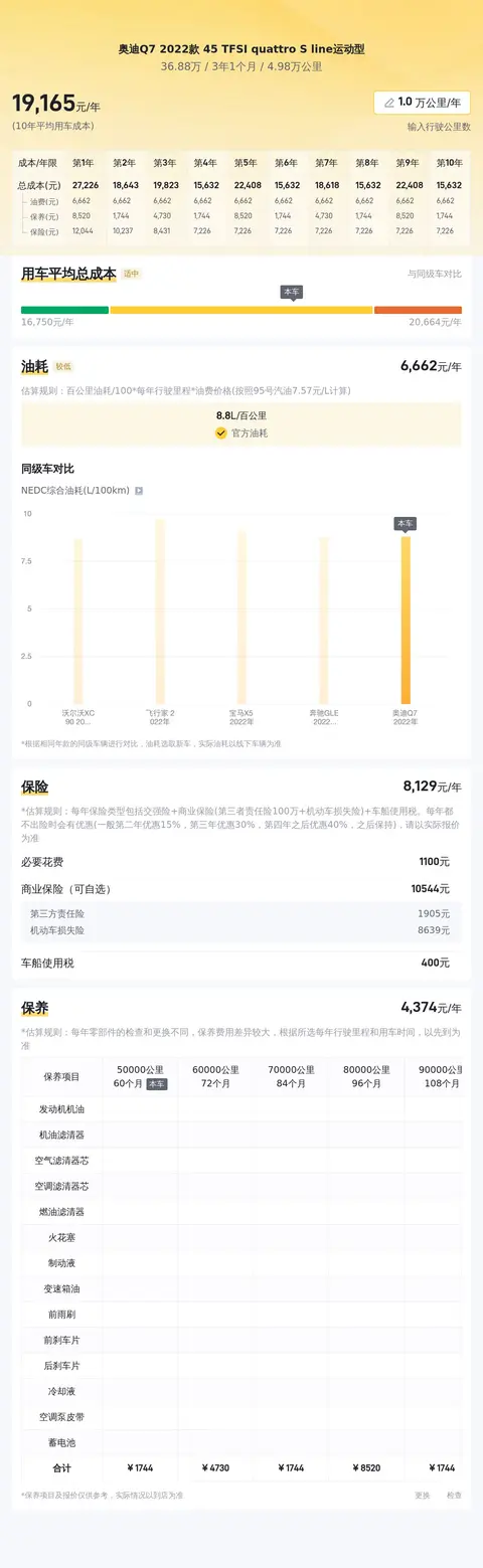 奥迪Q7 2022款 45 TFSI quattro S line运动型的10年平均用车成本是19073元/年,虽是豪车,但并不算高。