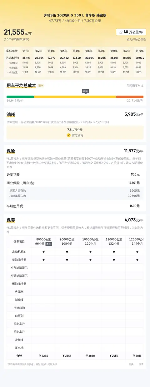 市场行情方面,当前这款车型的二手市场价格区间为47.57万至58.73万元,而本车的报价仅为47.73万元,处于市场低位,性价比突出。在用车成本方面,根据估算,这辆车的年均综合用车成本约为2.2万元,对于这样一个大家伙来说,也算是在正常值了。