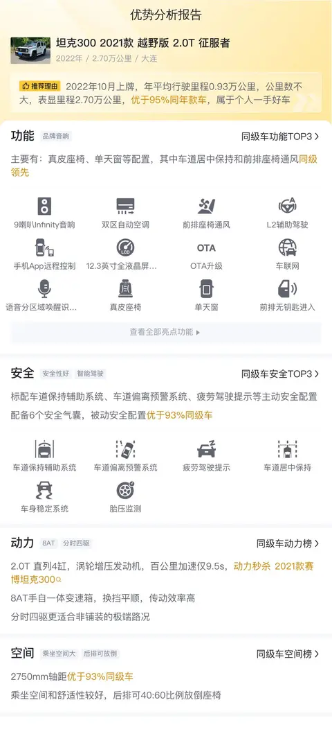 综合来看,这辆坦克300 2021款 越野版 2.0T 征服者的各方面表现都还不错,适合那些喜欢越野,又需要日常用车的车友选择,毕竟坦克300刚上市那会,提车都需要加价,可见其有多火爆,选择这样一辆二手车,价格更实惠,用车也能更舒心一些!