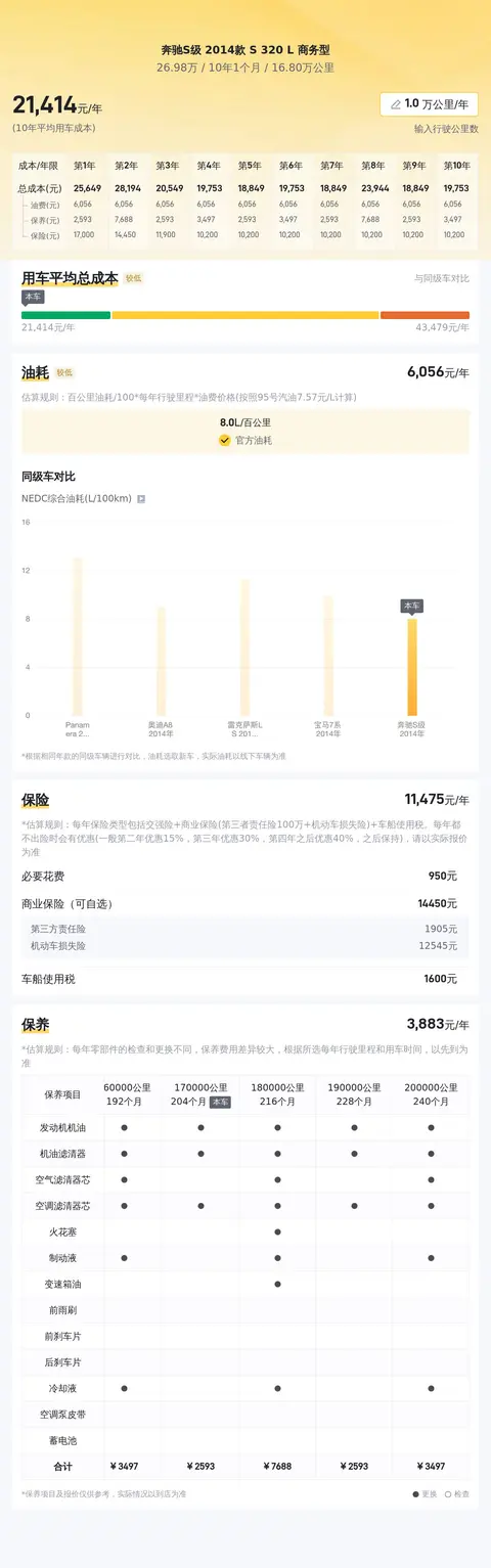 这辆奔驰S级2014款 S 320 L 商务型啊,确实是一位实力派的选手。它在动力、舒适性和安全性上啊,那可是下足了功夫,样样都不含糊。但是呢,人无完人,车也一样。它啊,也有自己的小九九。比如说,油耗啊,那就不是一般的低,得好好喂它啊!再比如说,保养啊,那可不是路边摊的货色,得去正规的修理店或者4S店才行。还有啊,它的高科技配置啊,那是相当的丰富,但有的功能啊,可能不太好操作,得花点时间琢磨琢磨。最后啊,还得提一句,这车子啊,跑得不少啊,16.80万公里的里程啊,那可不是个小数目。这些啊,都是得好好考虑考虑的。总的来说啊,这辆奔驰S级啊,优点多多,但缺点也不是没有。得好好权衡权衡,看看自己能不能接受这些小瑕疵。要是能接受啊,那它绝对能给您带来一段段美好的出行回忆;要是接受不了啊,那咱也别勉强,毕竟啊,适合自己的才是最好的嘛!