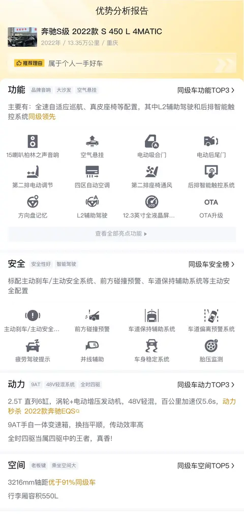 优点:这辆奔驰S级 2022款 S 450 L 4MATIC属于比较新的车,配置丰富,而且报价不高,性价比较高。不过这车动力强,油耗大,养车费用高,家用来说成本略高。