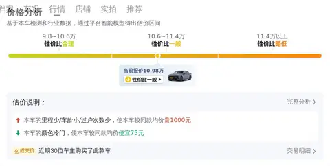 这辆车是2023年8月上牌的车,车龄2年2个月,少于均值0.1年,加价200元,该车行驶了1.8万公里,少于均值0.9万公里,加价700元,该车过户0次,少于均值0.1次,加价100元,该车颜色为深灰色,市场欢迎度一般,加价-75元,综合各种因素加起来,该车应该加价925元,也就是说这辆车合理的市场定价应该是11.91万,当然,市场行情价跟最终成交价是有差异的,具体还得看车主怎么谈判。