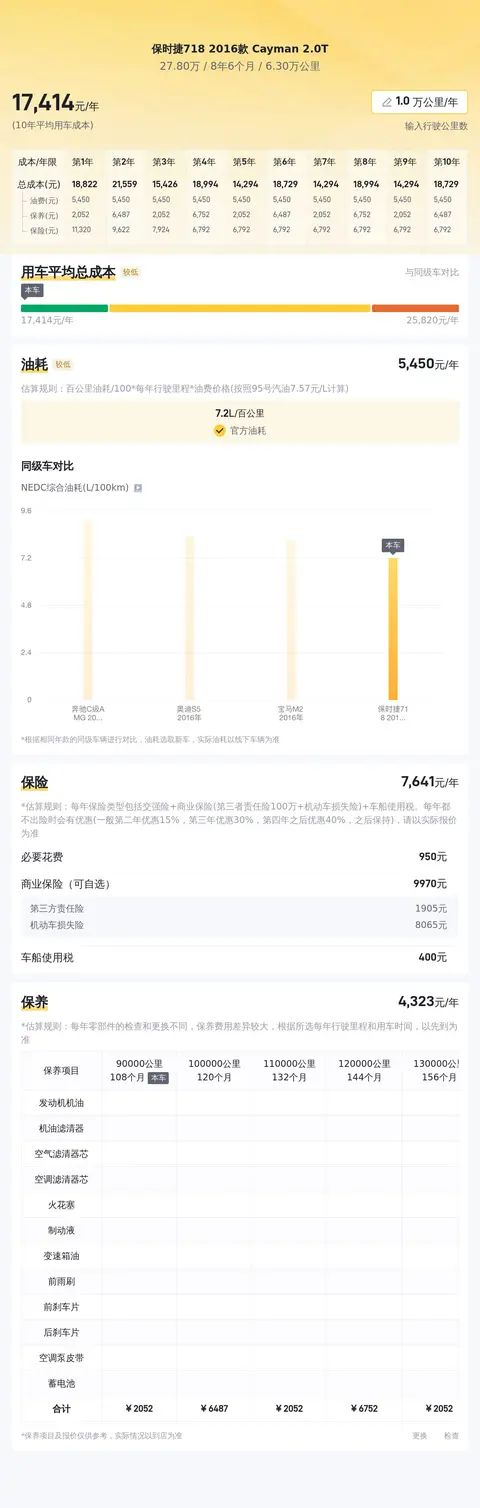在用车成本部分,根据懂车帝的大数据分析,该车6年的平均用车成本约为17186元/年,这一数字在豪华跑车阵营中属于合理范围。需要注意的是,实际费用会根据车主的实际使用情况和保养选择有所变动。