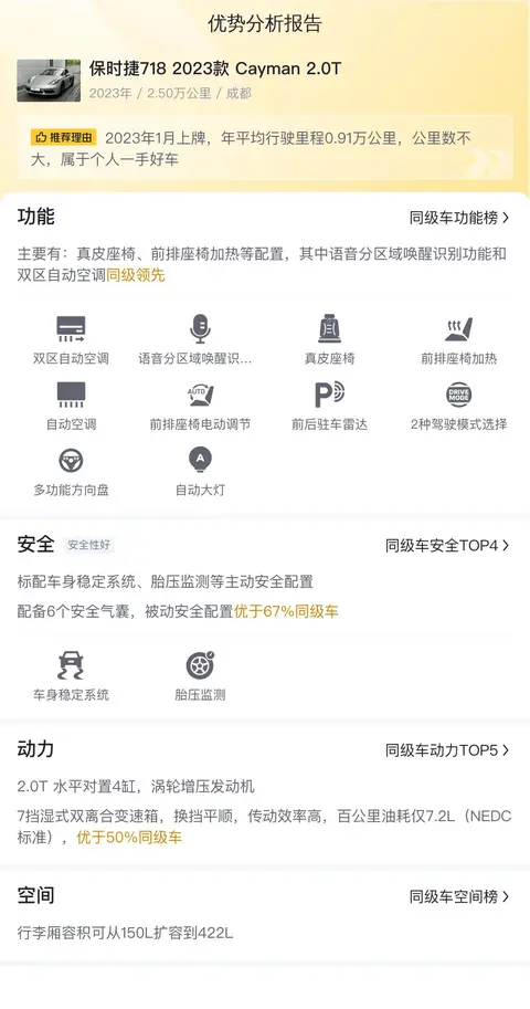 这辆二手保时捷718的具体版本是——2023款 Cayman 2.0T,定位跑车,上牌地为成都,上牌日期2023年1月,表显里程2.5万公里,银灰色车身浅色内饰,新车指导价56.5万,二手车报价46.8万,过户次数0次。