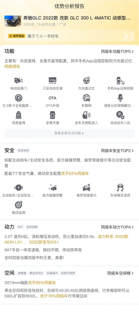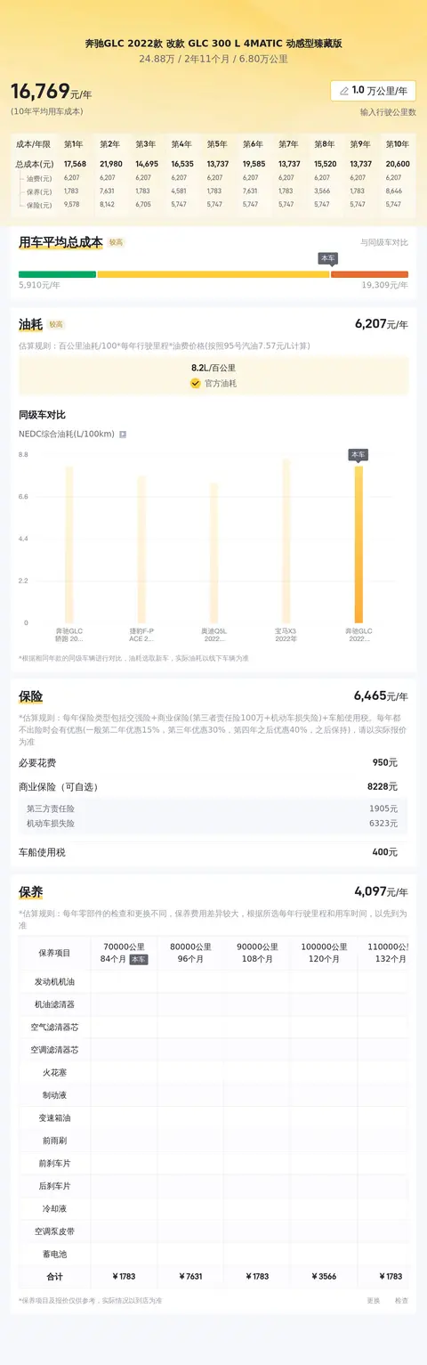 缺点是按照每年2万公里行驶里程计算,奔驰GLC 2022款 改款 GLC 300 L 4MATIC 动感型臻藏版的能耗成本较高,同时保养成本也不低,所以用车成本较高;另外,后排座椅角度偏斜,长时间乘坐可能会感到不适。