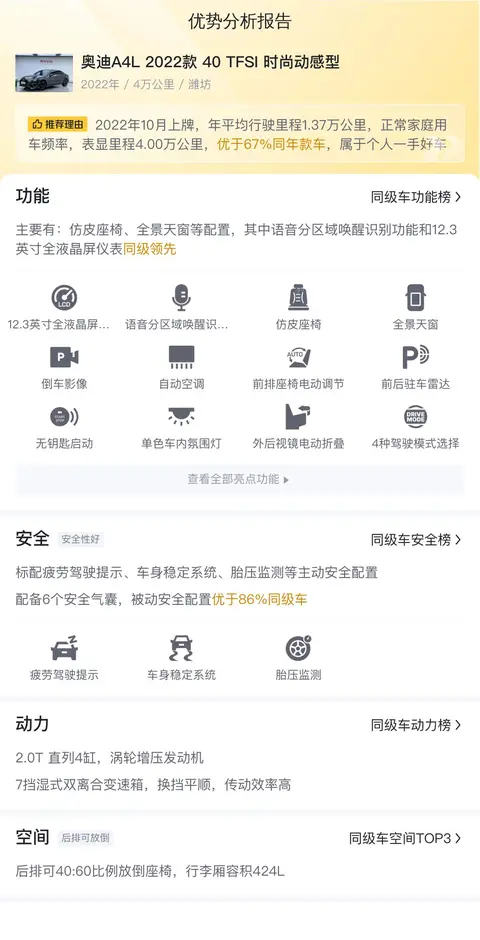 综上所述,奥迪A4L 2022款 40 TFSI 时尚动感型是一款集豪华、动力、操控、舒适于一体的中型车代表作之一。无论是从外观设计、内饰品质、动力性能还是智能互联等方面来看,它都展现出了奥迪品牌的实力和魅力。同时,较高的保值率也为消费者带来了更多的价值保障。然而,在面对新能源车型的市场竞争时,奥迪A4L 2022款 40 TFSI 时尚动感型在油耗以及动力类型方面可能存在一定的局限性。总的来说,如果您正在寻找一款豪华、动力强劲、操控出色的中型车,那么奥迪A4L 2022款 40 TFSI 时尚动感型将是一个不错的选择。