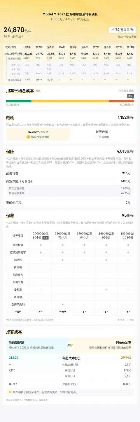 另外,Model Y 2021款 标准续航后轮驱动版的10年平均用车成本是8366元/年,也算是正常花费。