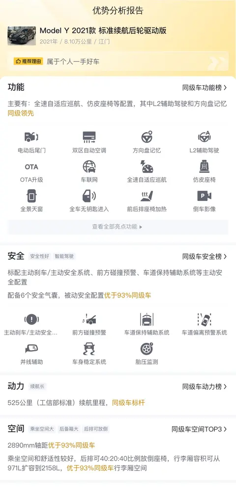 优势:Model Y作为全球销冠车型,本身具有很高的知名度,市场欢迎度高,保值率也高。动力强劲,配置丰富。这套L2驾驶辅助系统表现非常成熟,多种场景都能应对自如。另外,车辆使用成本不高,行驶里程不算太高,车况尚可。