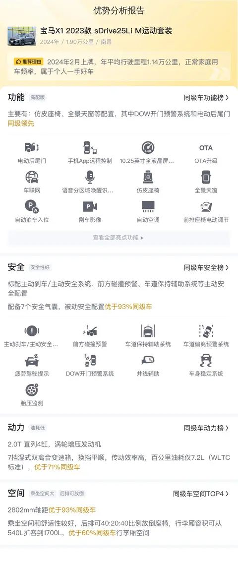 这辆2023款宝马X1 sDrive25Li M运动套装是一款车况良好、配置丰富的豪华紧凑型SUV。它不仅拥有宝马品牌的操控性能,还提供了宽敞舒适的空间和丰富的配置。对于追求品质和性价比的消费者来说,这款车无疑是一个不错的选择。需要注意的是,购买二手车时要仔细检查车辆的实际状况,避免购买到事故车或泡水车。建议您在专业人士的陪同下进行实地查看和试驾,以确保购买的车辆质量可靠。