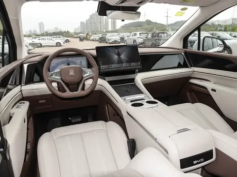 进入车内,座舱采用四水归堂设计理念,15.6英寸旋转中控屏与12.3英寸全液晶仪表构成数字交互核心,新增的HUD抬头显示可将导航信息投射至前风挡。Nappa真皮超柔云感座椅支持主驾8向/副驾4向电动调节,二排航空座椅配备腿托调节、小桌板及8点式按摩功能,第三排座椅支持10cm前后滑动与靠背角度无级调节。DiLink 150智能座舱支持三屏联动影音、AR眼镜投屏及28扬声器DiSound音响系统,配合可拆卸式户外蓝牙音箱(续航9小时),打造全场景娱乐生态。