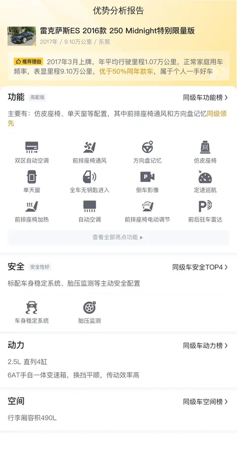 优势:雷克萨斯ES 2016款 250 Midnight特别限量版的舒适配置丰富,后排体验感较好,空间宽敞,储物空间多,而且乘坐舒适度高,适合家庭使用。此外,这款车的油耗相对较低,经济性好,符合现代家庭的节能需求。