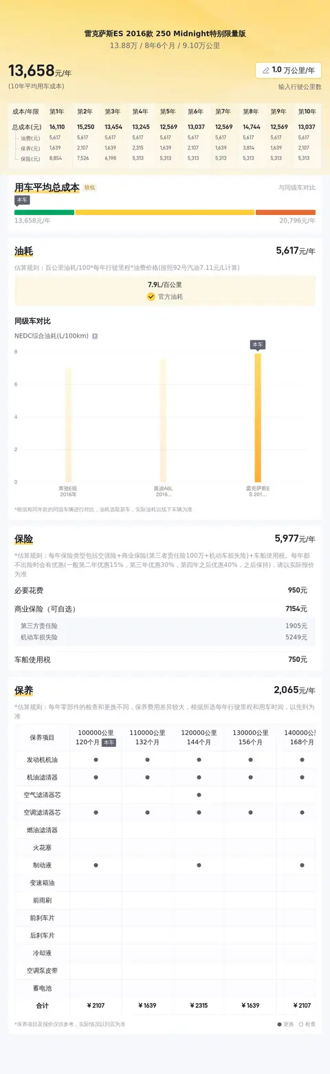 据估算,同级车的最低用车成本是13178元/年,最高是20764元/年,雷克萨斯ES 2016款 250 Midnight特别限量版是14130元/年,用车成本适中,不占优势。