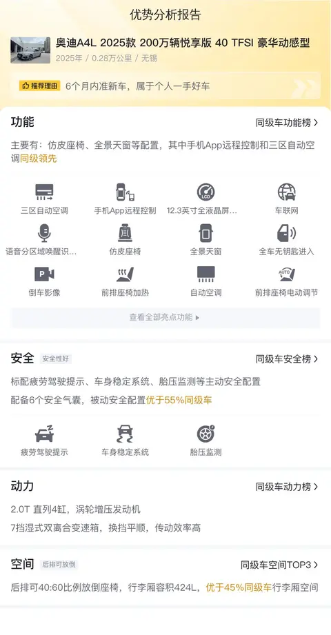 很多人买车其实都比较在意车况,今天说的这款奥迪A4L 2025款 200万辆悦享版 40 TFSI 豪华动感型经过了完全检测,拥有完整的全车深度检测报告,让你对这款车的所有情况都一清二楚,包括外观、内饰、底盘、发动机等等,都有详细的检测,做到让你买得安心、用得放心。