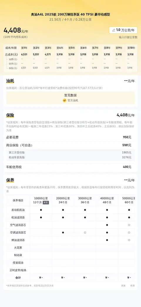 很多人买车只看买车时的价格,却忽略了用车的成本,其实这也是很重要的一部分,这款奥迪A4L 2025款 200万辆悦享版 40 TFSI 豪华动感型的10年平均成本大概是11670元/年,也属于正常水准,毕竟这样的好车,还是需要好好保养的。