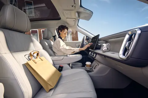 车内还有超过22处储物空间,驾驶位旁边的开放式多用途岛台,可以随手放手机、钥匙;后排座椅侧面有纸巾盒、可翻折的杯托,照顾到了后排乘客的使用习惯。副驾区域还能自己加装折叠桌板、手机支架,按照自己的喜好改造。前排座椅靠背能180度放平,再配上那块1.83平方米的全景天幕(还带电动遮阳帘),充电时或者周末想在车里休息一会儿,躺在座椅上看看天,感觉也挺惬意。