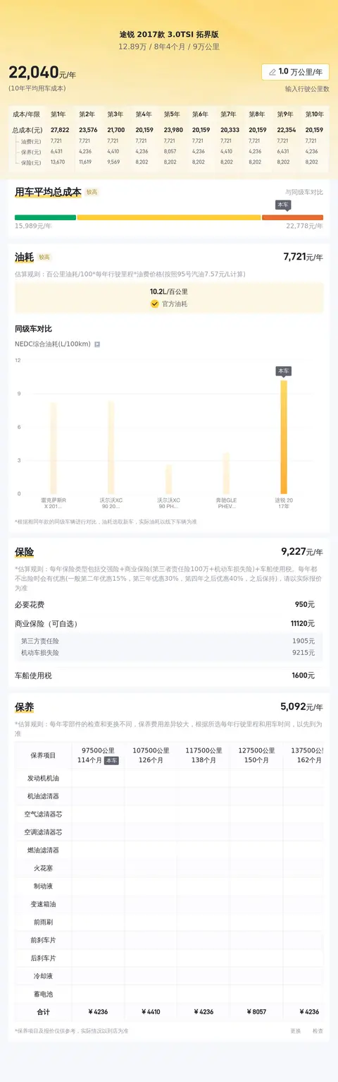 途锐2017款3.0TSI拓界版的10年平均用车成本是22035元/年,同级车的最低10年平均用车成本是18468元/年,最高是30620元/年,所以它的用车成本适中。