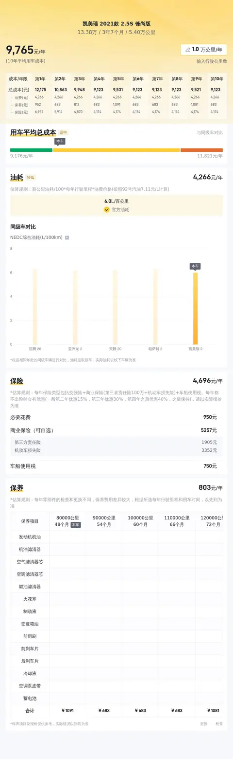 在用车成本部分,根据懂车帝官方大数据分析,凯美瑞2021款2.5S锋尚版的10年平均用车成本大约为10156元/年,这是一个相对合理的水平,与同级别车型相比并无明显劣势。车辆的油耗表现较为优秀,其NEDC综合油耗为6.0L/100km,这在同级别车型中属于较低的水平。按照当前油价计算,每年的油费大约为4860元,这一数字对于大多数车主来说都是可以接受的。凯美瑞2021款2.5S锋尚版的保险费用大约为4488元/年,这也是一个比较合理的金额。此外,车辆的保养费用大约为1212元/年,这一费用包括了常规保养和可能的维修费用,相较于其他豪华品牌车型来说,凯美瑞的保养费用还是比较亲民的。