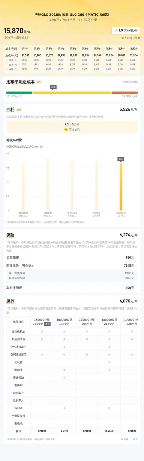 基于懂车帝对奔驰GLC的在售车型大数据分析,本车的百公里油耗为7.3升。每年的保养费用约为4,686元,保险费用约为5,608元。总体来看,这款车型的使用成本相对合理,能够满足大多数消费者的预算需求。在不考虑其他费用的情况下,每年的用车成本大约为16,166元,对于一款豪华SUV来说,这一成本可以说是相当具有竞争力的。无论是从日常通勤的角度来看,还是从偶尔的长途驾驶的角度来看,这款车型都能够为消费者提供合理的使用成本,让他们在享受驾驶乐趣的同时,也无需过多担心经济负担。