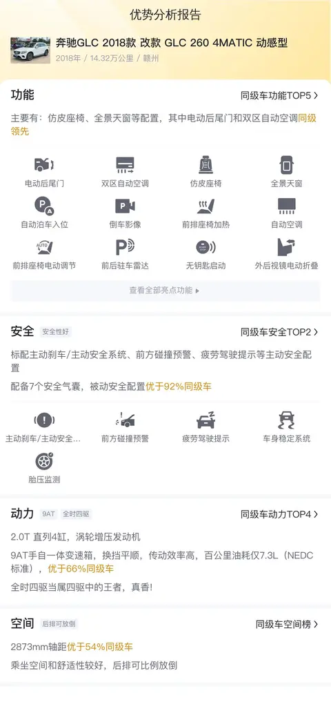 功能配置方面,本车拥有诸多亮点。首先,其电动后尾门和双区自动空调在同级别车型中处于领先地位,为乘客带来了极大的便利和舒适。其次,车辆配备了仿皮座椅、全景天窗等高端配置,进一步提升了乘坐的舒适性和品质感。此外,无钥匙启动功能也为驾驶者带来了更多的便捷性。在动力配置方面,本车搭载了2.0T直列4缸涡轮增压发动机和9AT手自一体变速箱。这一动力组合不仅提供了强劲而平稳的驾驶体验,还确保了出色的燃油经济性。百公里油耗仅为7.3L(NEDC标准),这一数据优于61%的同级别车型。同时,车辆配备的全时四驱系统更是当仁不让的四驱王者,为驾驶者带来了无与伦比的操控和稳定性。在空间配置方面,本车同样表现出色。其2873mm的轴距优于54%的同级别车型,为乘客提供了宽敞而舒适的乘坐空间。而后排座椅的比例放倒设计则进一步提升了车辆的装载能力和灵活性。在安全配置方面,本车同样毫不妥协。其标配的主动刹车/主动安全系统、前方碰撞预警以及疲劳驾驶提示等主动安全配置,为驾驶者和乘客提供了全方位的安全保障。而在被动安全配置方面,本车配备了7个安全气囊,这一配置优于86%的同级别车型,再次彰显了其在安全方面的卓越表现。