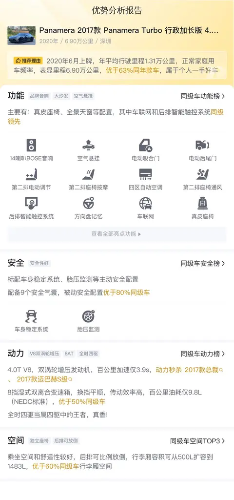 报价相对较低,因为这台Panamera 2017款 Panamera Turbo 行政加长版 4.0T的市场行情价是99.87万-121.21万,它的报价则是99.8万,所以价格上有优势,同时保值率也较高。