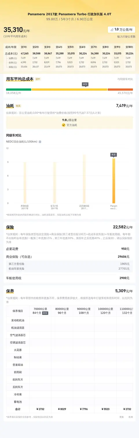 此外,据估算,这台车的用车成本也较低,因为同级车的最低用车成本是34456元/年,最高是56226元/年,Panamera 2017款 Panamera Turbo 行政加长版 4.0T是34644元/年,所以较低。