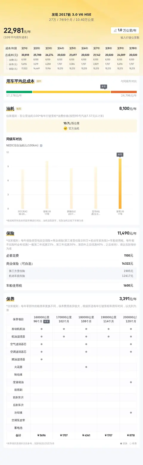 据估算,同级车的最低用车成本是17983元/年,最高是25766元/年,发现 2017款 3.0 V6 HSE是23138元/年,所以用车成本适中。