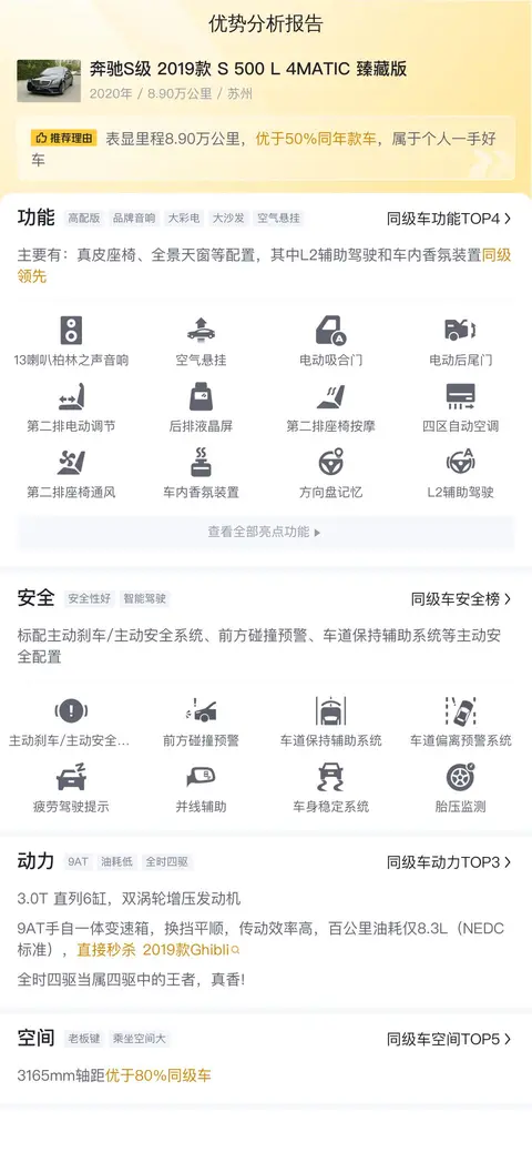 总结说来,这款二手奔驰S级 2019款 S 500 L 4MATIC臻藏版在动力性能、底盘悬挂、制动系统、主被动安全辅助、操控舒适配置以及车身尺寸和空间表现等方面都表现出色。其豪华的内饰、先进的科技配置以及宽敞舒适的乘坐空间使其成为一款集豪华与实用于一身的豪华轿车。在选择购买时,建议您根据自己的实际需求、预算以及对车辆性能和配置的具体要求等因素来进行综合考虑和判断。最后,希望您早日找到心仪的车型,享受愉快的驾乘体验!