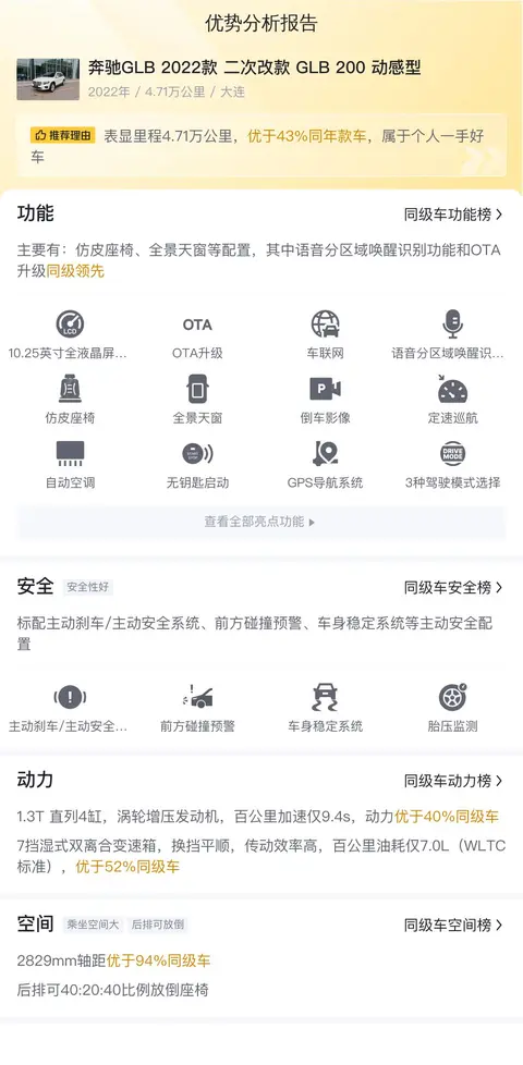 接下来,让我们把目光转向这辆二手奔驰GLB的具体情况。这车是2022款的二次改款GLB 200动感型,首次上牌时间为2022年9月,至今行驶里程为4.7万公里。车源地位于大连,上牌地也在大连,这种车源地与上牌地一致的情况,通常意味着车辆的使用更为规范,且更易核查车辆的真实情况。更值得一提的是,这款白色奔驰GLB尚未有过户记录,表明其车主信息清晰,车辆历史简单明了。