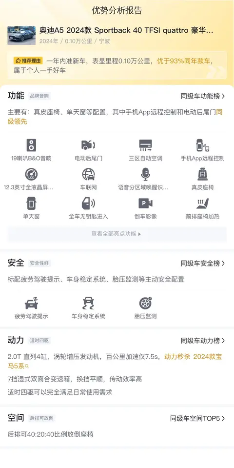 这辆奥迪A5 2024款 Sportback 40 TFSI quattro 豪华动感型优势很明显,作为2024款的车型,配置丰富,且标配了主动刹车/主动安全系统、前方碰撞预警、车道保持辅助系统等主动安全配置,安全性较高。搭载的2.0T直列4缸涡轮增压发动机,百公里加速仅7.5s,动力强劲。新车含税价44.74万,现在28.88万的报价,相当于开1年多便宜了15.86万,性价比也很高。