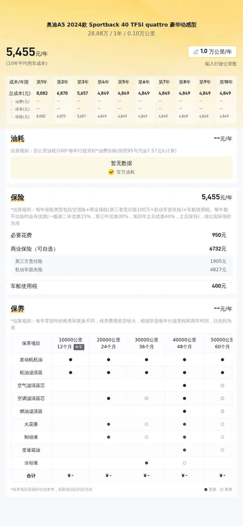 据估算,奥迪A5 2024款 Sportback 40 TFSI quattro 豪华动感型的用车成本是5907元/年,算是正常花费,具体费用看个人用车习惯而定。