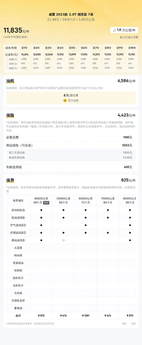 在用车成本上,经估算,这辆车的10年平均用车成本是12445元/年,而同级别车型的最低10年平均用车成本是11466元/年,最高是13724元/年,所以这辆车的用车成本适中。