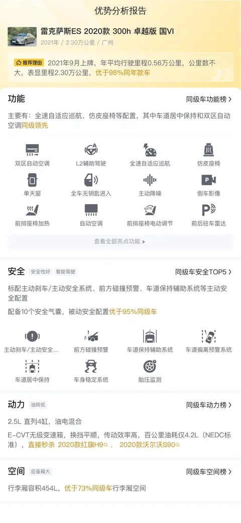 个人认为这款车最大的优势就是价格,因为它的价格比市场行情价还要低,加上只有2.3万公里的行驶里程,所以这个价格很占优势。其次就是配置,其中全速自适应巡航、前方碰撞预警、车道居中保持等配置,不仅让开车更轻松,还提高了行车的安全性。最后是油耗低,作为家用车,低油耗意味着更低的用车成本。