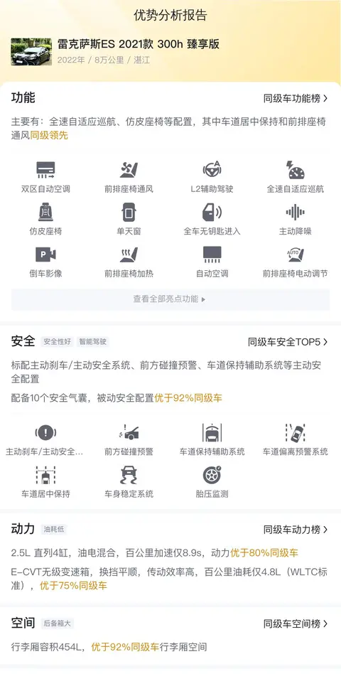 雷克萨斯ES 300h是一款集豪华、性能、舒适和安全于一身的日系豪华轿车。其先进的混合动力系统、高品质的内饰配置、丰富的安全技术以及合理的性价比都使其成为了众多消费者购车时的首选。该车型的市场表现良好,受到了消费者的广泛认可和好评。在二手车市场,雷克萨斯ES 300h也具有较高的保值率和流通率。根据最新的市场数据,该车型在全国中型车销量榜排名Top6,说明其在市场上的受欢迎程度较高。同时,其合理的二手价格也让更多的消费者能够享受到这款豪华轿车的品质和性能。