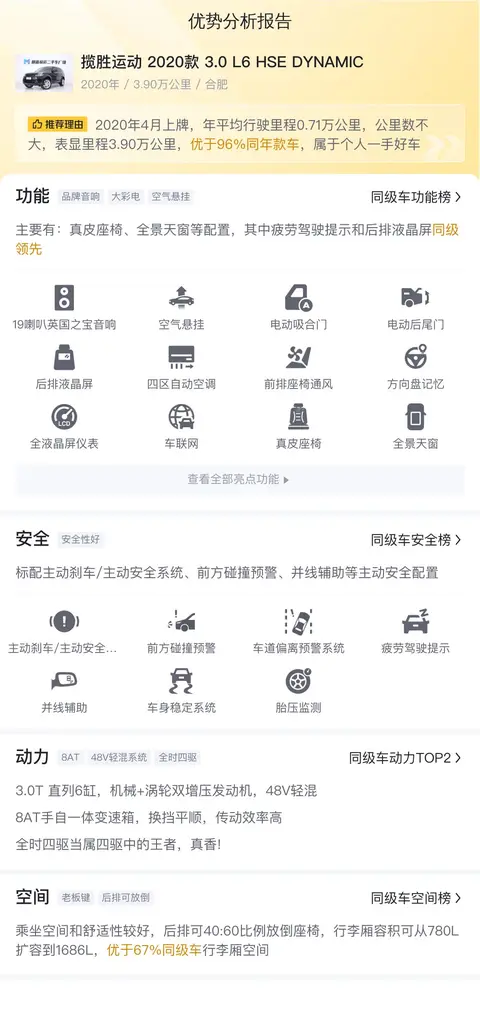 综上所述的新车含税价、用车成本、市场行情、优势分析、同款比价等数据仅供参考。在配置部分,因为二手车非标品,车辆可能会存在配置改装的情况,具体车况信息需要线下结合车辆实际情况进行综合参考。