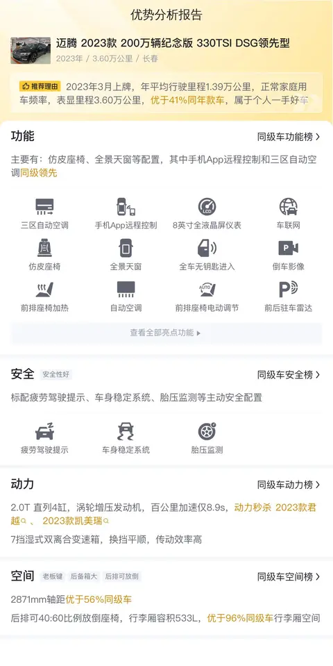 综上所述的新车含税价、用车成本、市场行情、优势分析、同款比价等数据仅供参考。在配置部分,因为二手车非标品,车辆可能会存在配置改装的情况,具体车况信息需要线下结合车辆实际情况进行综合参考。