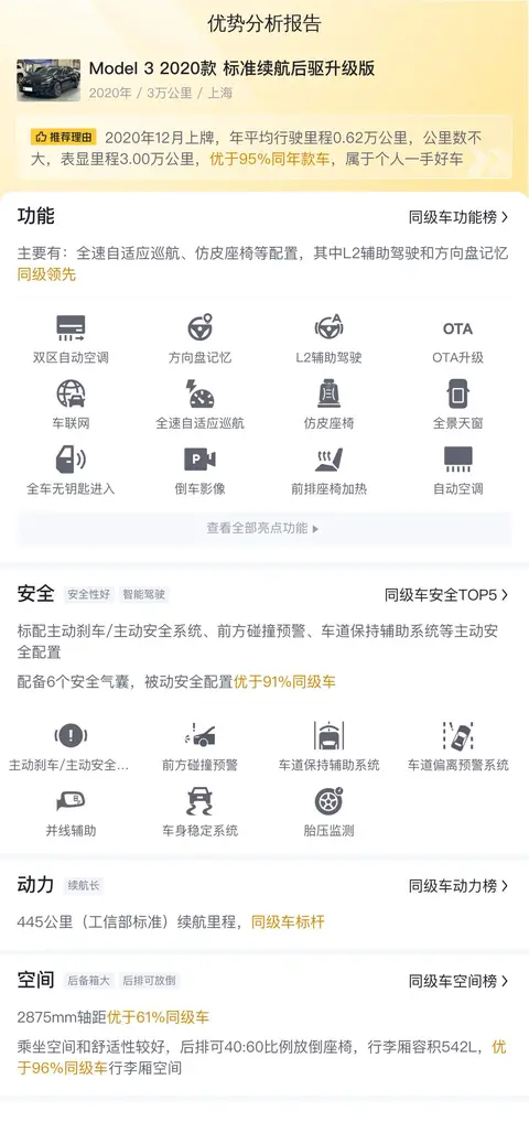 这辆Model 3配备了全速自适应巡航、仿皮座椅、L2辅助驾驶、方向盘记忆等丰富配置,其中L2辅助驾驶和方向盘记忆在同级别车型中处于领先地位。动力方面,该车搭载了一台最大功率为202kW(约合275马力)的永磁同步单电机,最大扭矩为404N·m,工信部工况续航里程达到468km,纯电续航里程为445公里。在加速性能方面,该车的0至100公里/小时加速时间仅为5.6秒,展现了其出色的动态响应能力。
