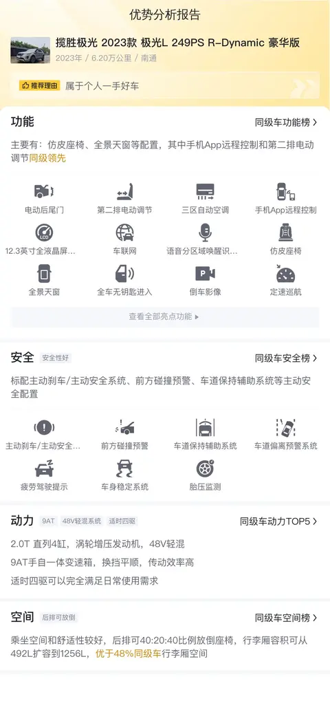 为了让您更清晰地掌握这款车在市场上的表现,我们通过数据分析比较了该车在安全配置、动力表现及空间舒适性等方面与同级别车型的差异。
