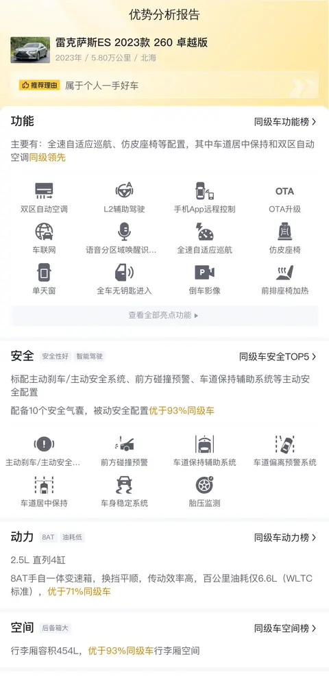 优势:毕竟是不到两年的准新车,性能方面没什么好挑剔的,动力强劲,配置丰富,整体状况良好,没有明显损坏的部件。雷克萨斯品牌知名度尚可,保值率高。油耗低,用车成本比较实惠。