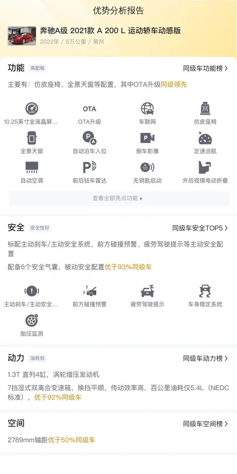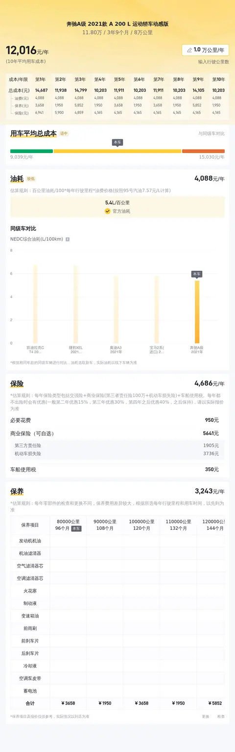 在选择一辆车的时候,我们不仅要考虑购入时的花费,还要把目光放长远,考虑到日常使用的成本。根据大数据分析,这款二手奔驰A级 2021款 A 200 L 运动轿车动感版的年均综合用车成本大约为1.2万元左右,这包括了燃油、保险以及保养等费用。值得一提的是,这款车的百公里油耗仅为5.4L,这一数据优于92%的同级别车型,这意味着在日常使用中,它能为您节省不少燃油开支。保险方面,预估每年保费约为5104元,保养费用则约为1628元,这些都在合理范围内。