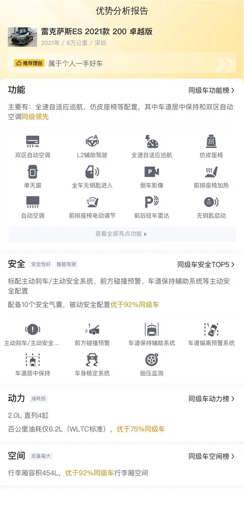 优势:雷克萨斯ES 2021款 200 卓越版的舒适性配置较好,配备仿皮座椅、前后排座椅加热等配置,前后排的舒适度都有保障。同时配备全速自适应巡航、车道居中保持等配置,帮助驾驶者操控,更加轻松。再加上,10气囊的配备,安全性也有保障。