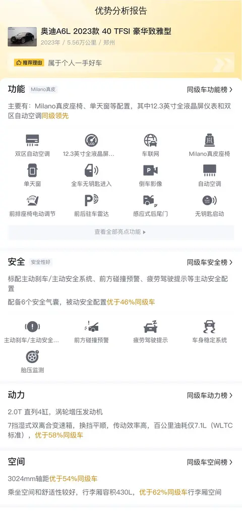 总之,这款奥迪A6L 2023款 40 TFSI 豪华致雅型是一款集性能、配置、安全和性价比于一身的优秀车型。无论是对于追求品质生活的消费者还是对于追求驾驶乐趣的驾驶者来说,它都是一个不错的选择。如果你正在寻找一款高品质的二手车,那么不妨考虑一下这款车吧!