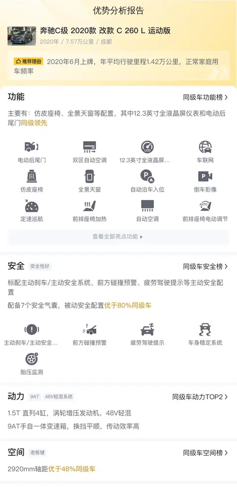 先介绍一下这辆二手奔驰C级 2020款 改款 C 260 L 运动版的基本情况,该车车源地为成都,上牌时间为2020年6月,过户次数为1次,行驶里程为7.57万公里,新车指导价34.68万,二手车报价14.68万。车身颜色为深灰色,排放标准为国六。
