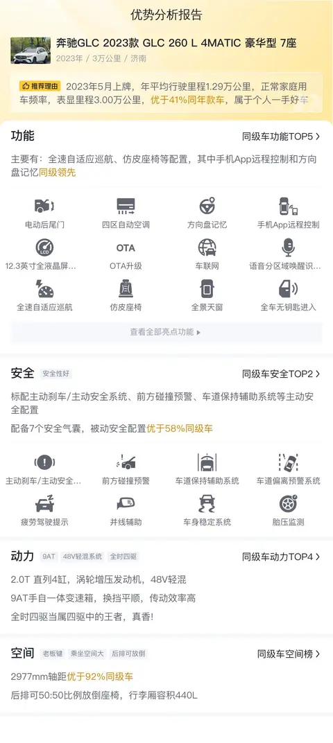 这辆二手奔驰GLC 2023款 GLC 260 L 4MATIC 豪华型 7座上牌地为山东济南,上牌时间为2023年5月,表显里程3万公里,车身颜色为白色,个人一手车未过户。新车指导价46.55万,目前二手车报价29.98万,目前该车符合国VI排放标准。