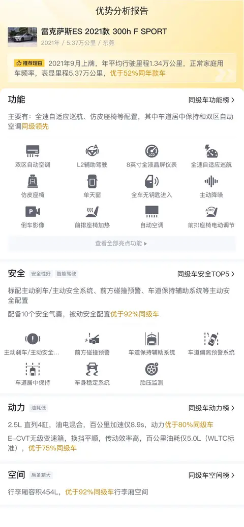 雷克萨斯ES是LEXUS雷克萨斯历史上最成功、销量最高的车型之一。自1989年第一代ES面世以来,雷克萨斯ES在国际市场上早已成为豪华、优雅、舒适的代名词。今天要说的雷克萨斯ES 2021款 300h F SPORT ,它不仅有着帅气的外形设计,还有着不错的动力表现。这款车的新车含税价为45.11万,2021年09月在东莞上牌,总里程是5.37万公里,共有1次过户记录,二手车报价是26.73万。