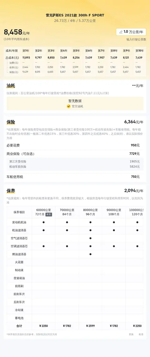 用车成本方面,按一年行驶一万公里计算,这款雷克萨斯ES 2021款 300h F SPORT 的用车成本是4615元,用车成本不高。