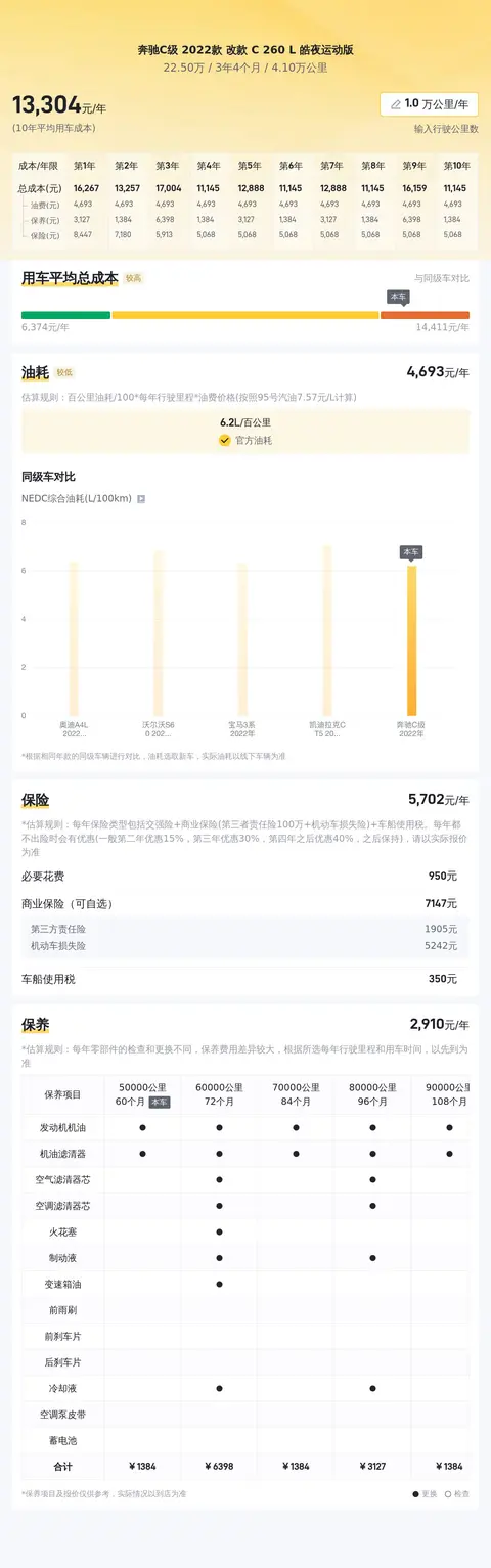 据估算,同级车的最低用车成本是6506元/年,最高是15786元/年,奔驰C级 2022款 改款 C 260 L 皓夜运动版是13133元/年,用车成本不算低。
