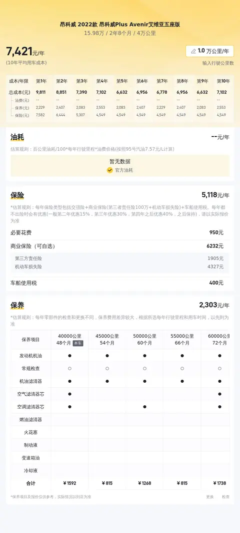 根据当前的市场行情,这辆昂科威 2022款 昂科威Plus Avenir艾维亚五座版的二手车报价在15.98万元左右。在用车成本方面,按照每年行驶2万公里计算,未来10年的平均用车成本约为每年1.4万元左右。这一数字涵盖了油费、保养费、保险费以及可能出现的其他费用。